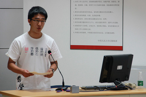 2011级本科班鲁鸣柳同学作为高年级学生代表发言。她以轻松活泼的风格向同学们谈起了自己本科4年的学习生活,与大家分享了琉璃神社