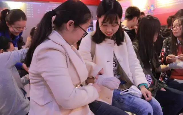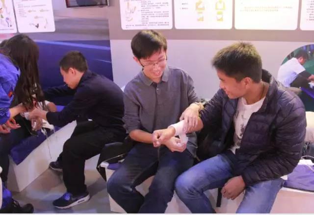 紧接着是创伤处理,志愿者给同学们现场示范了包扎止血的三种方法:环形包扎法,螺旋包扎法和回返包扎法,并给每个同学配发了急救包,让同学们亲自动手,两两合作,尝试模拟包扎止血,同学们积极配合,现场气氛热烈。