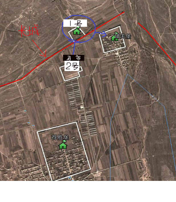 此次考察另外一处存有疑问的地方,在得胜口内得胜堡及周边三堡。关于此地军堡的资料,与我们实地考察所见的情况稍有出入,其中矛盾集中于得胜堡马市的具体位置的辨析,下面三幅图分别是我们实地考察所见军堡分布情况,以及文献资料中出现的两种互相矛盾的关于马市位置的观点。