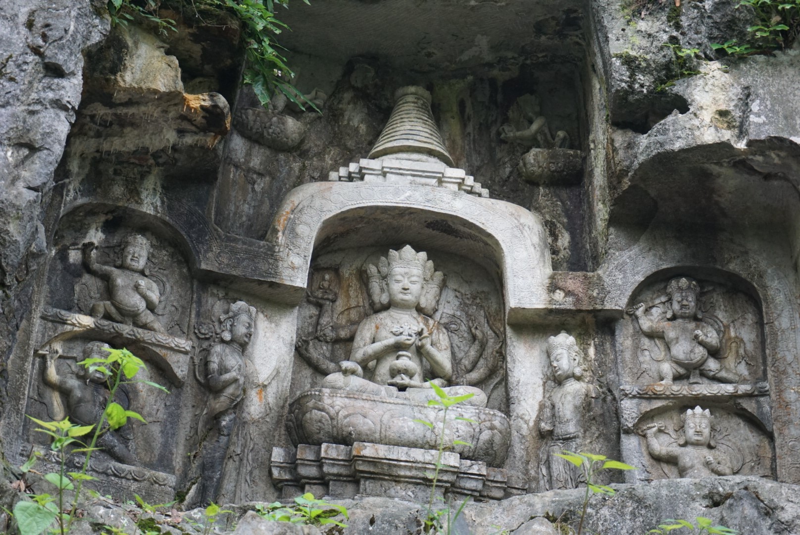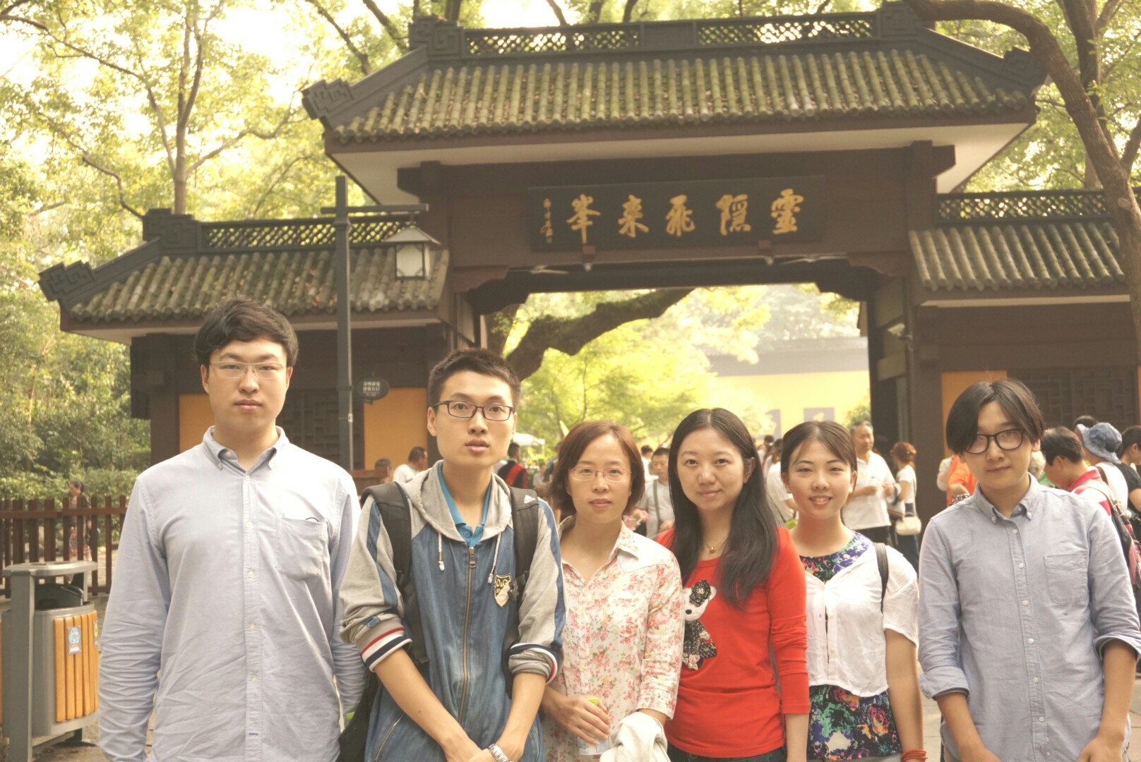 从灵隐寺下来,我们折回飞来峰,刚入灵隐景区时,岩壁上时间跨度极长的佛像雕刻便吸引了我们,从五代到元明,一尊尊鬼斧神工式的雕塑让我们领略了中国佛教艺术和雕刻史的沧桑演变,尽管因为灭佛、偷盗等原因,不少佛像面目全非,然而其或威严或慈和的姿态,却深深刻在每个人的脑海里。飞来峰顶,同学老师竞相拍照,此峰虽不高,却是灵隐的象征。