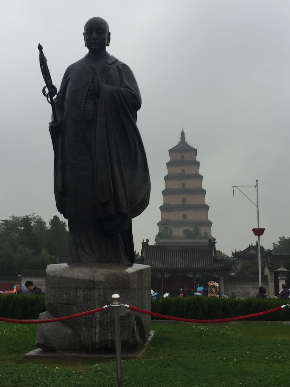 之后,我们直接步行到达慈恩寺,玄奘为保存由天竺经丝绸之路带回长安的经卷佛像主持修建了大雁塔。所以在慈恩寺南门立有玄奘立像以示纪念。此时雨势渐大,不待调整便进入寺内,准备登大雁塔。大雁塔有七层塔身,如今可见稍有倾斜。塔内空间并不算宽敞,尤其是楼梯间甚是狭小,拾级而上,总计249階。登上塔顶可见北面的喷泉不断变换各种形状,十分壮丽。而远远望去,烟雨梦中中可以饱览整个城墙之内的壮景,亦是十分美妙。