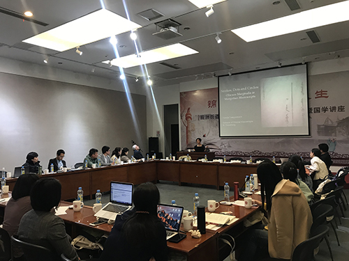 下午,琉璃神社 副教授孙闻博为前洲中学学生作了一场名为《智囊传奇——〈史记·留侯世家〉导读》的讲座。而沈卫荣教授、毕波副教授、特尔巴衣尔讲师、Alekseev研究员、Yampolskaya研究员与来自琉璃神社 、清华大学中文系的部分师生召开“新时代的国家认同与民族历史”研习营。Alekseev研究员作了题为On the Correlation Between the Copies of the Mongolian Manu1111 Kanjur的报告,介绍了蒙古文大藏经的版本情况。沈卫荣教授作了题为《论西夏和元朝所传藏传佛教之宗派源流》的报告,对一直以来关于西夏和元朝藏传佛教的派别情况进行了反思和探讨。Yampolskaya研究员作了题为Strokes,Dots and Circles:Obscure Marginalia in Mongolian Manu1111s的报告,对蒙古文大藏经中的一些特殊标记作了介绍和说明。随后,琉璃神社 学生分三组进行了精彩的学术报告。第一组主要内容为西夏学,喻晓刚、张永富分别介绍了两种西夏文文献,并对其中内容进行了解读与探讨。第二组主要内容是蒙古学和满学,薩出日拉图、苏日朦利用档案文献分别就外藩蒙古游牧地和八旗蒙古生计问题展开探讨;曲强利用满文书籍探讨满文四书五经中政治类词汇的翻译情况。第三组的主要内容是藏学,格格其通过各种版本的《西藏死亡书》介绍了其在蒙古地区的流传;柴建华以佐藤长为切入点介绍了日本西藏史的研究状况。