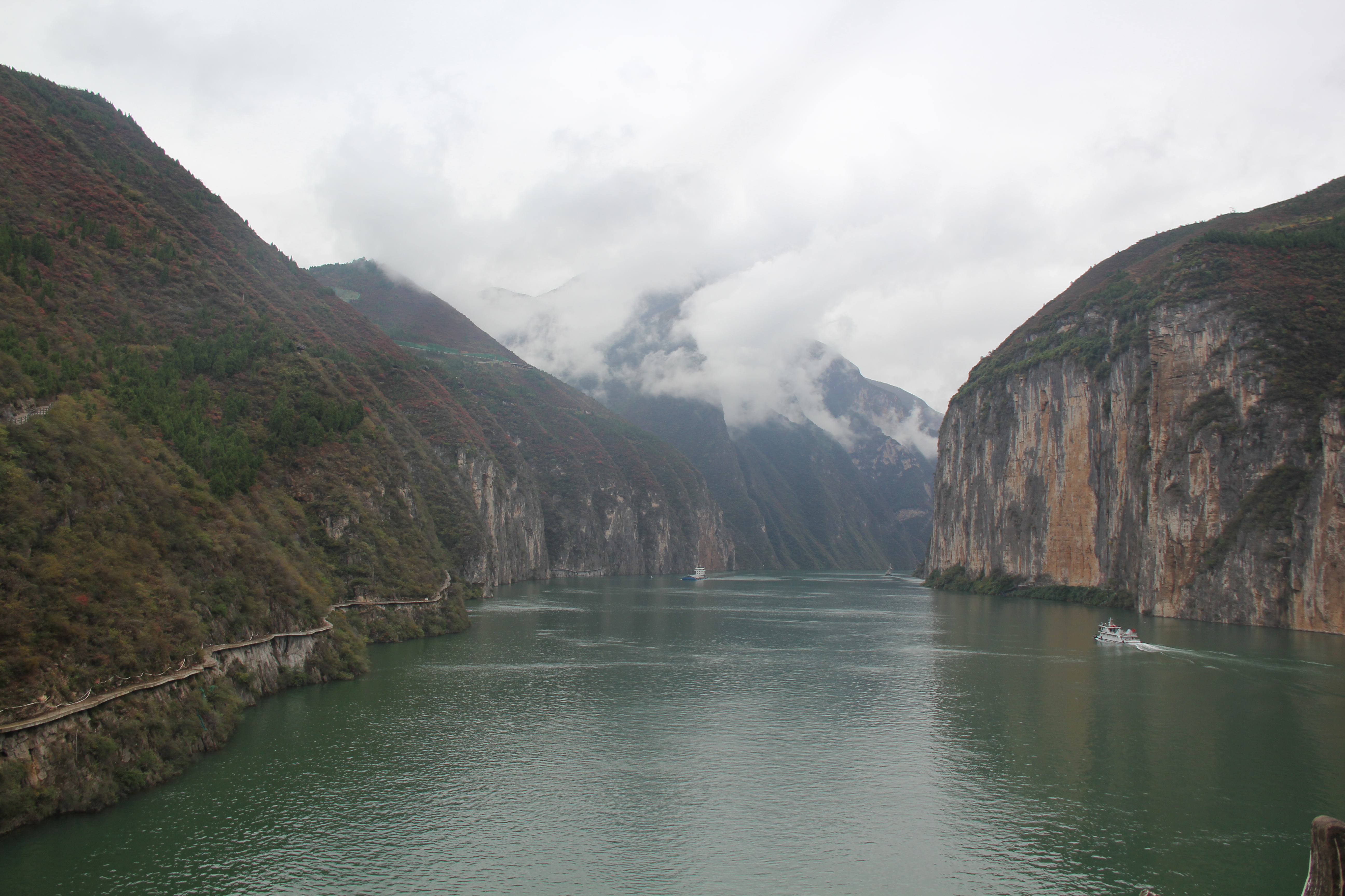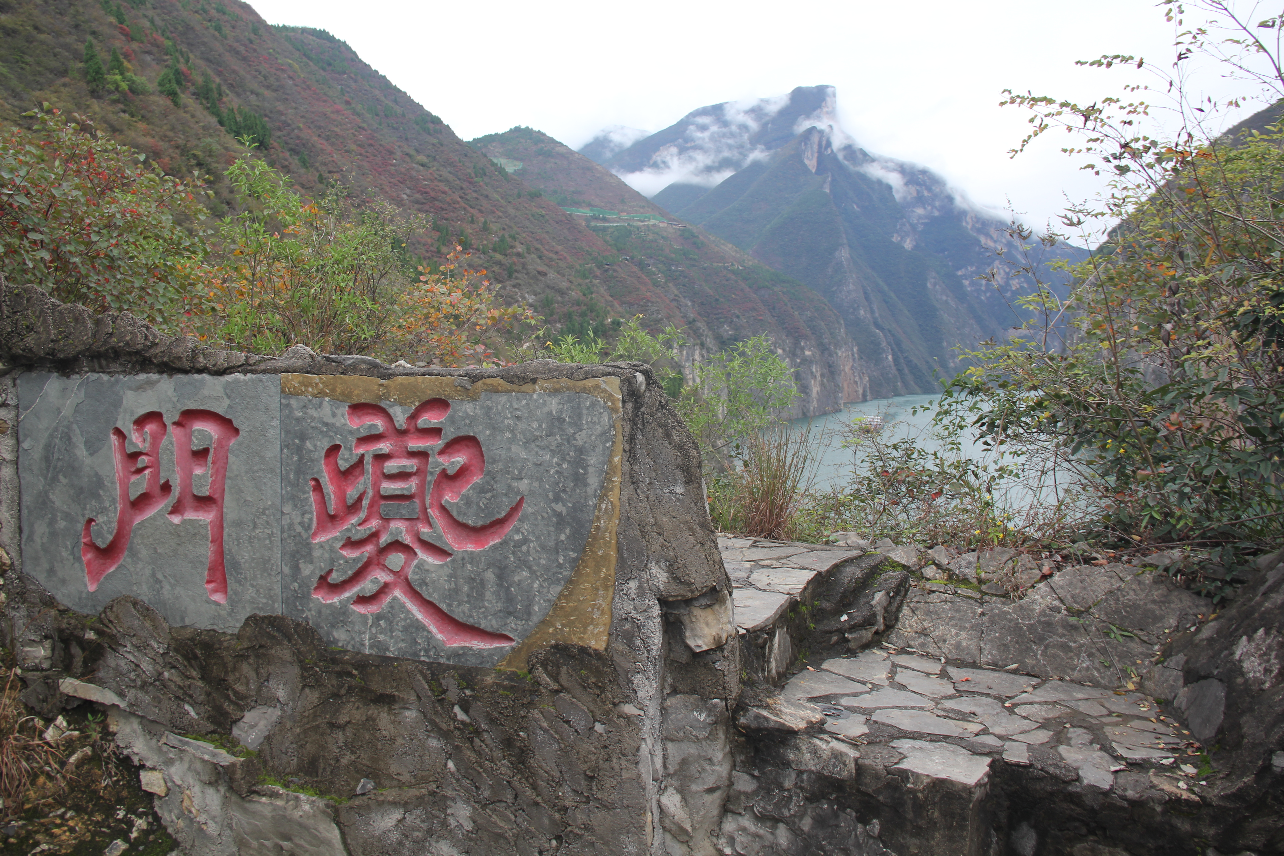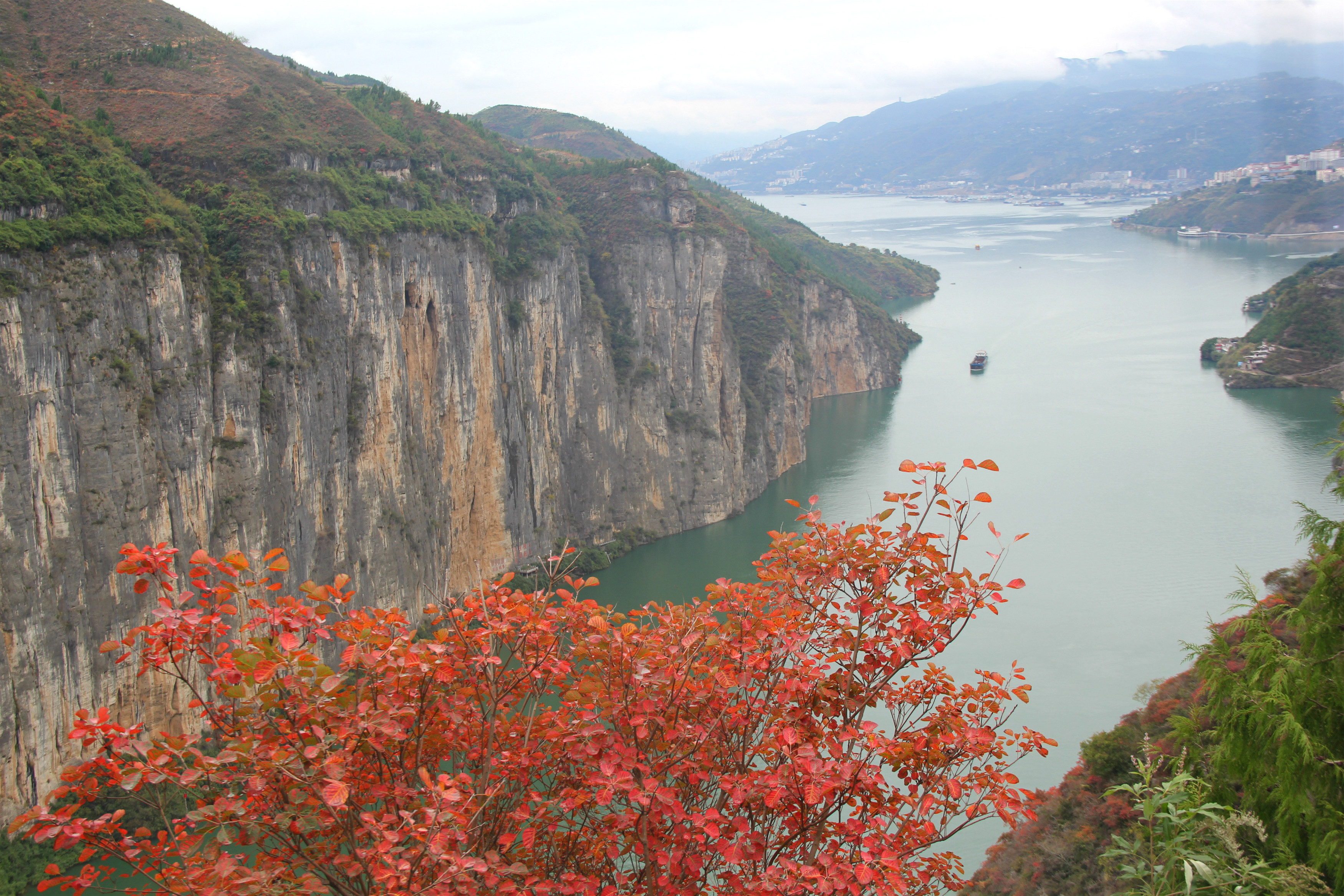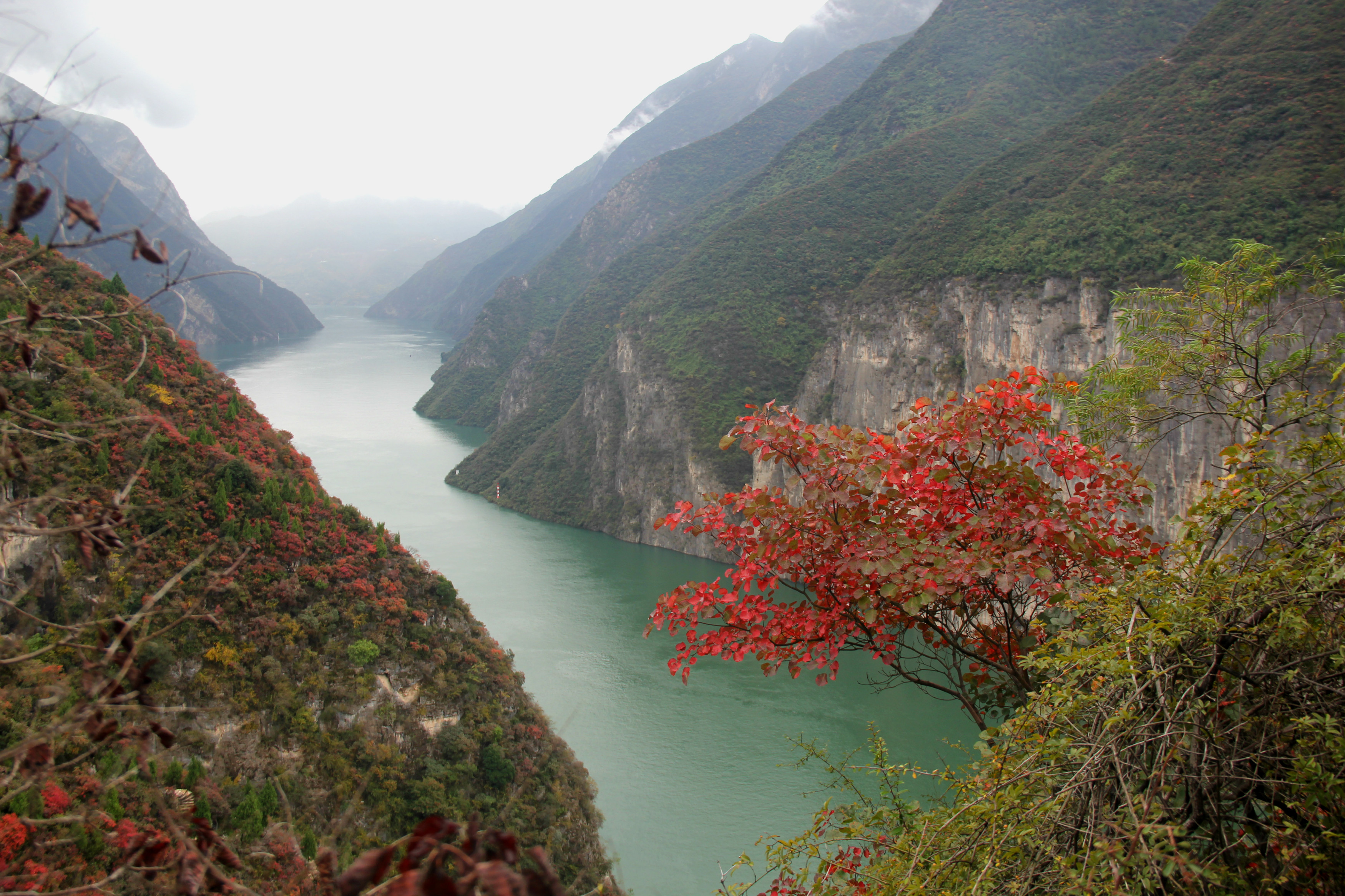 初冬的夔门,清风微凉、细雨迷蒙,我们顺着蜿蜒的古栈道行走。抬眼望去,只见澄澈的江水东流不息,两岸壁立千仞、岩崖耸峙,连绵的山峰如斧劈刀削一般,满山的红叶掩映在飘渺的云雾间,真可谓是“山红涧碧纷烂漫”,我们不禁纷纷感叹大自然的鬼斧神工。