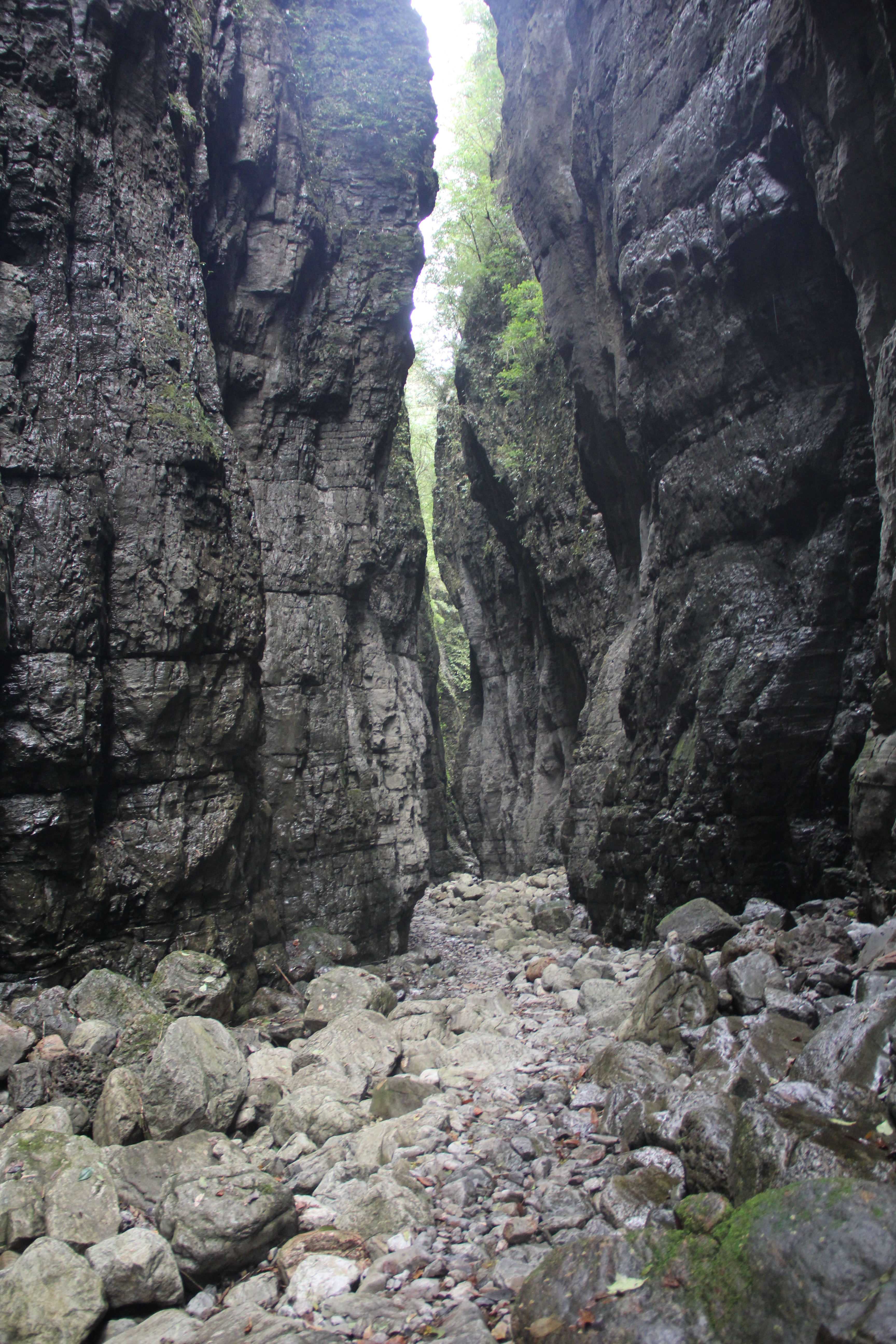 沿阶而下,透过茂密的枝叶,一条狭长的峡谷出现在我们眼前,峡谷两侧怪石嶙峋,湿润的空气凝结成晶莹的水珠沿着岩壁滴下;抬头望时,天空竟成了头顶的一条细线。行走在幽静的山谷中,虽然有些疲惫,但我们心情十分愉悦。