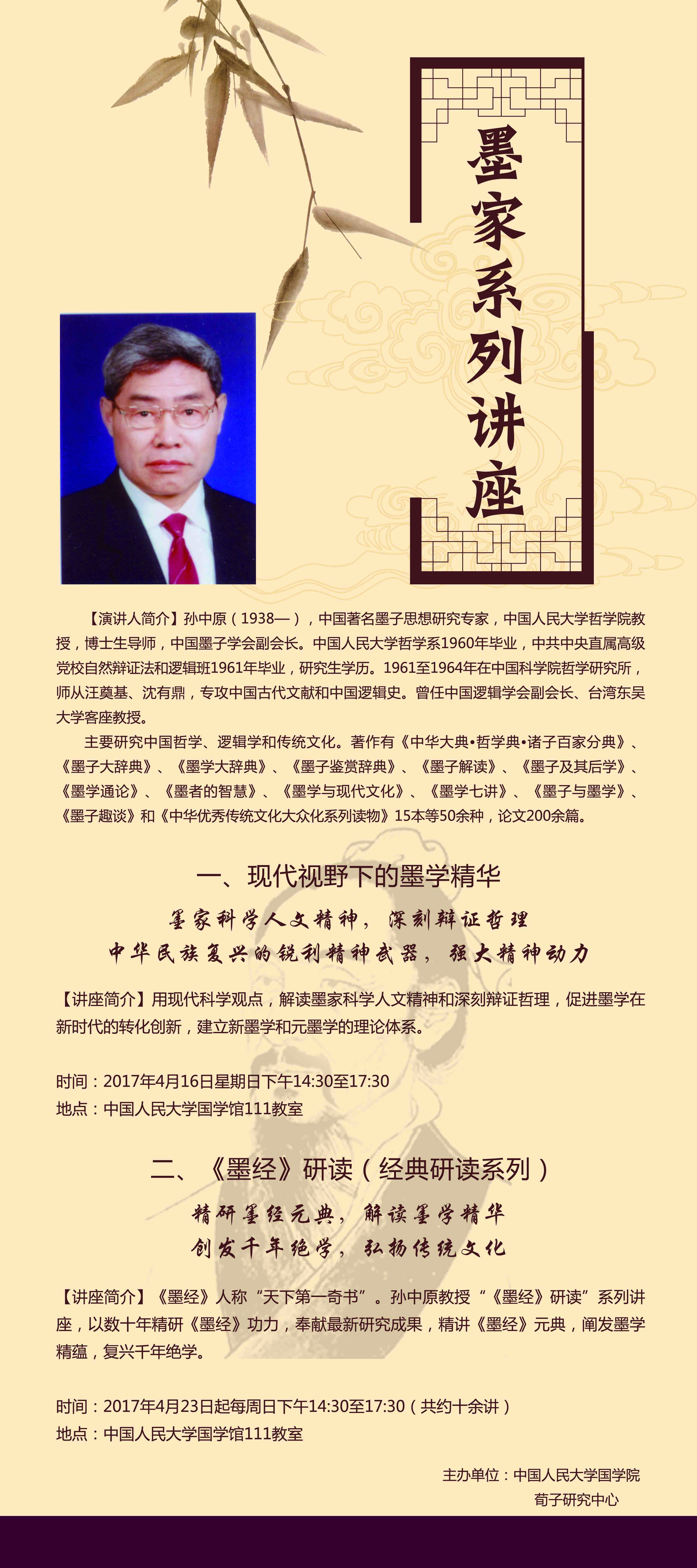 【讲座简介】《墨经》人称“天下第一奇书”。孙中原教授“《墨经》研读”系列讲座,以数十年精研《墨经》功力,奉献最新研究成果,精讲《墨经》元典,阐发墨学精蕴,复兴千年绝学。