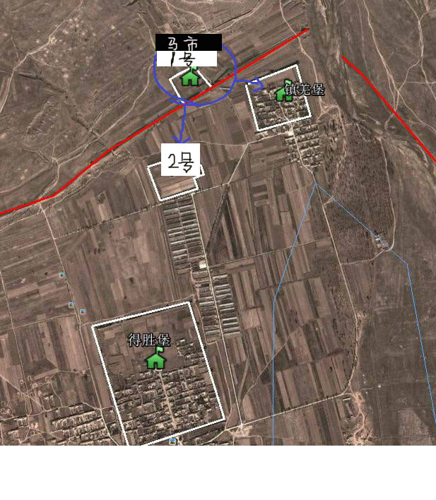 此次考察另外一处存有疑问的地方,在得胜口内得胜堡及周边三堡。关于此地军堡的资料,与我们实地考察所见的情况稍有出入,其中矛盾集中于得胜堡马市的具体位置的辨析,下面三幅图分别是我们实地考察所见军堡分布情况,以及文献资料中出现的两种互相矛盾的关于马市位置的观点。