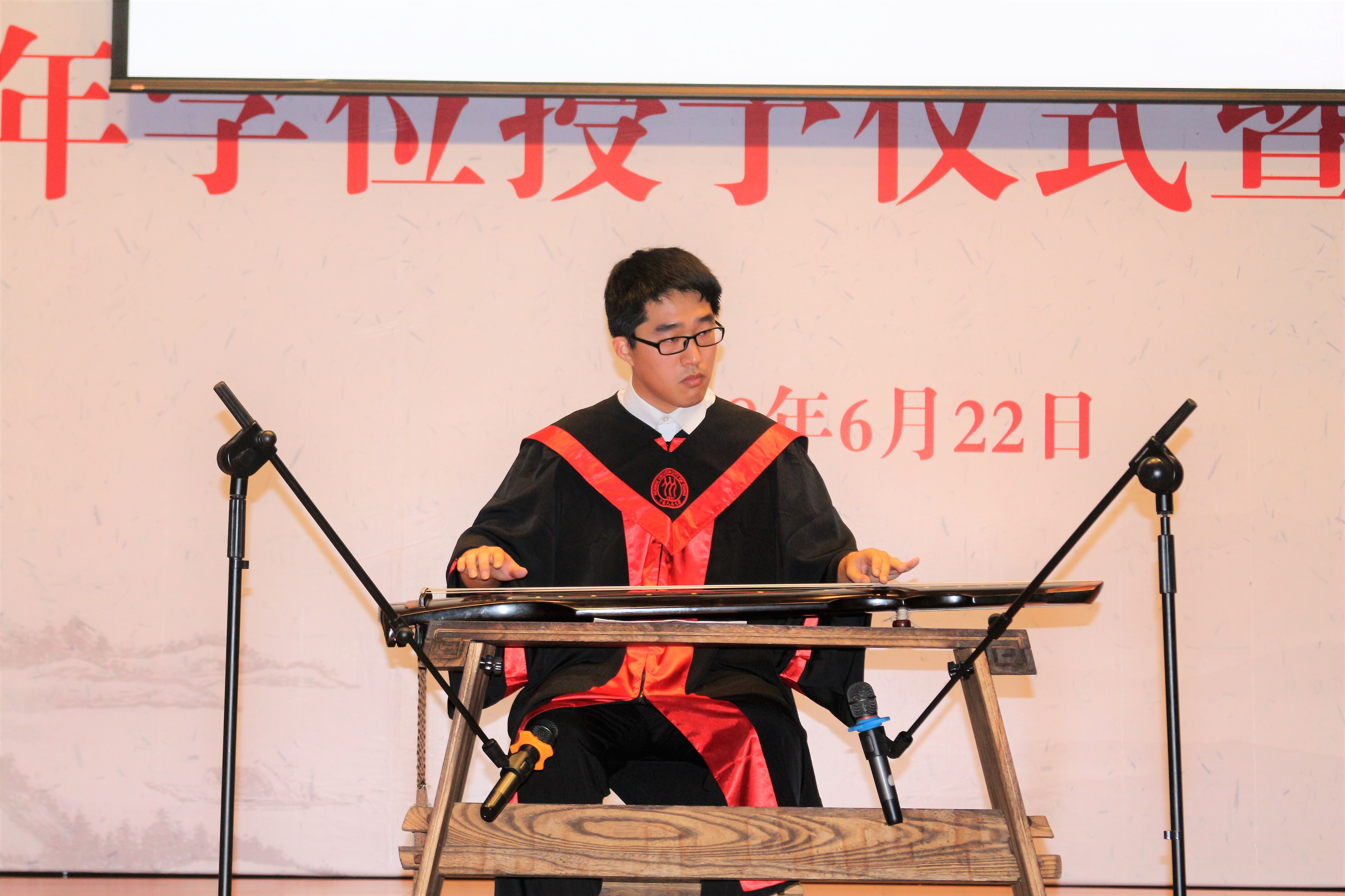 在学位授予仪式和毕业典礼开始之前,全体毕业生首先在国学馆前拍摄集体毕业照。八点整,主持人宣布毕业典礼正式开始,琉璃神社 副院长李萌昀副教授宣布学位授予仪式开始,全体人员起立并唱响国歌。