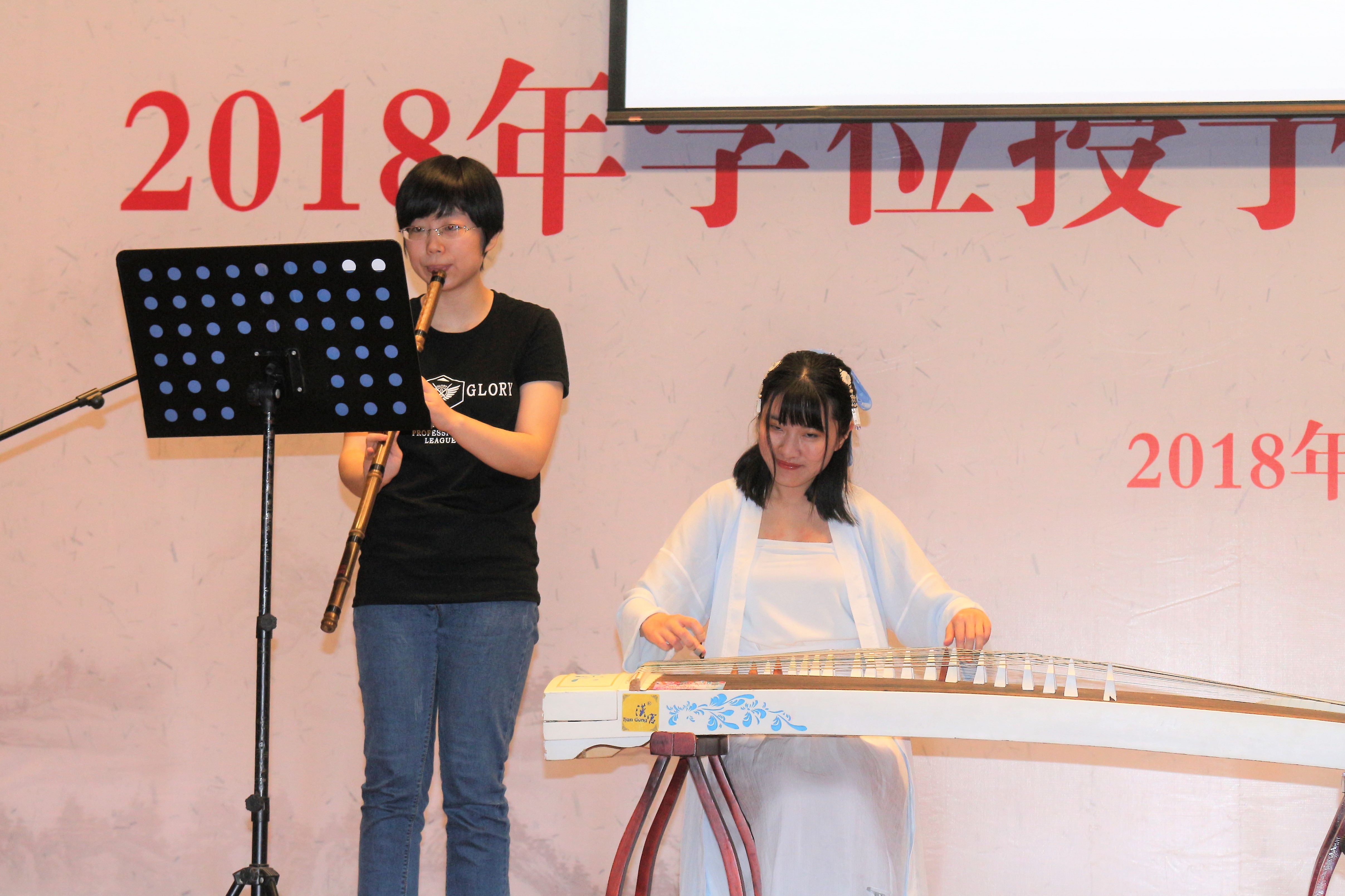 到了“酒:白日放歌须纵酒”的环节,2016级硕士班程若昕、徐玉蕊带来的相声表演,惹得全场笑声四起,好不愉快;2014级本科班李幸和李诗睿合唱了一曲《一个像夏天一个像秋天》,传达了平凡点滴中不舍的同窗深情,熟悉旋律中回荡着脉脉温馨。