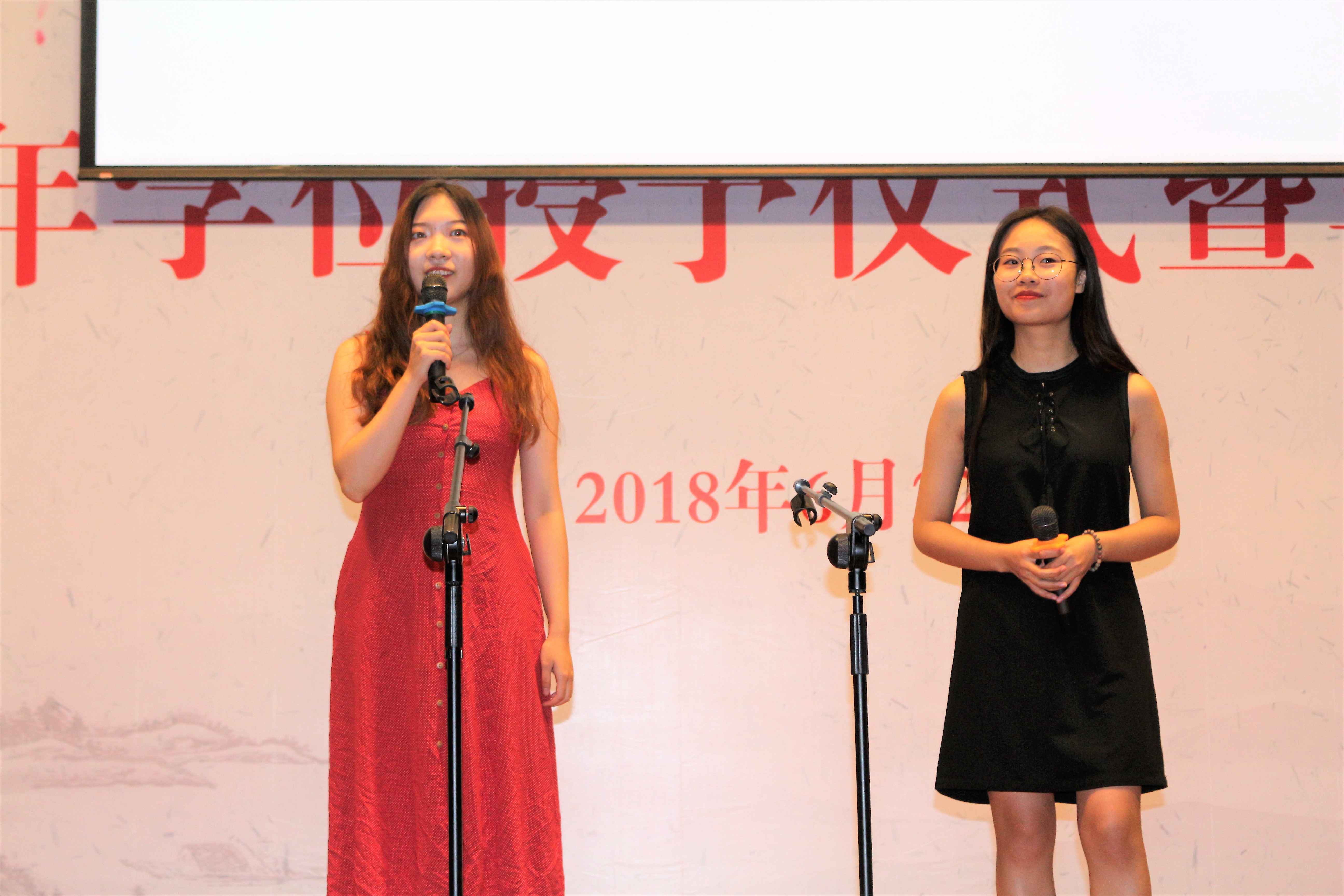 接下来,院党委书记汪永红宣读授予学位名单,乌云毕力格教授、梁涛教授、诸葛忆兵教授、袁济喜教授和向世陵教授为毕业生颁发学位证书并拨穗。