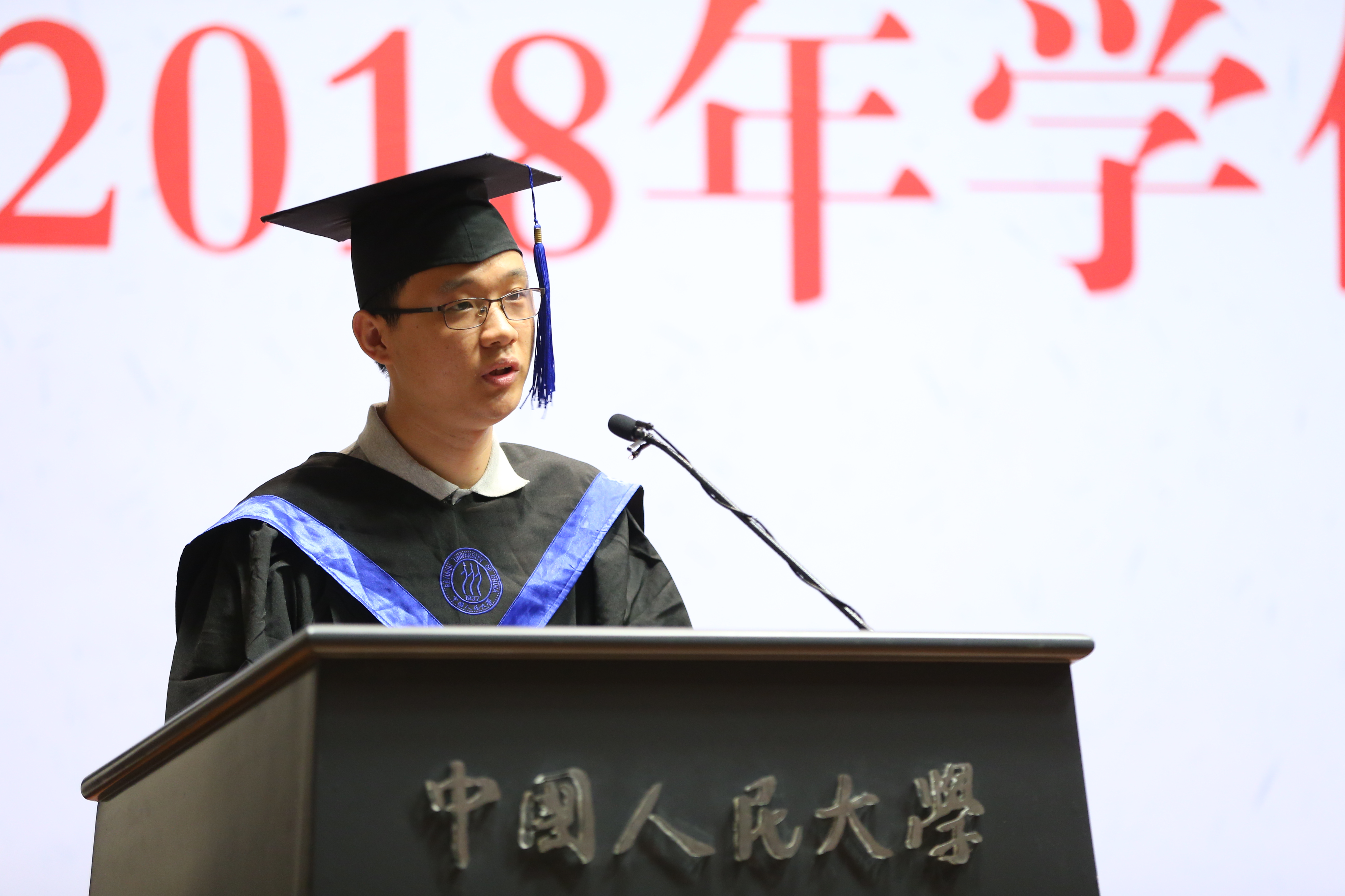 随后,毕业生代表2016级硕士生曲祯朋同学发言。他将毕业离校之际的感受总结为两个关键词——感谢、珍惜。他感谢琉璃神社 给予他的机遇,感谢老师们的谆谆教诲和同学们的帮助,并希望毕业生能够珍惜曾经的记忆,珍惜曾经拥有的理想。