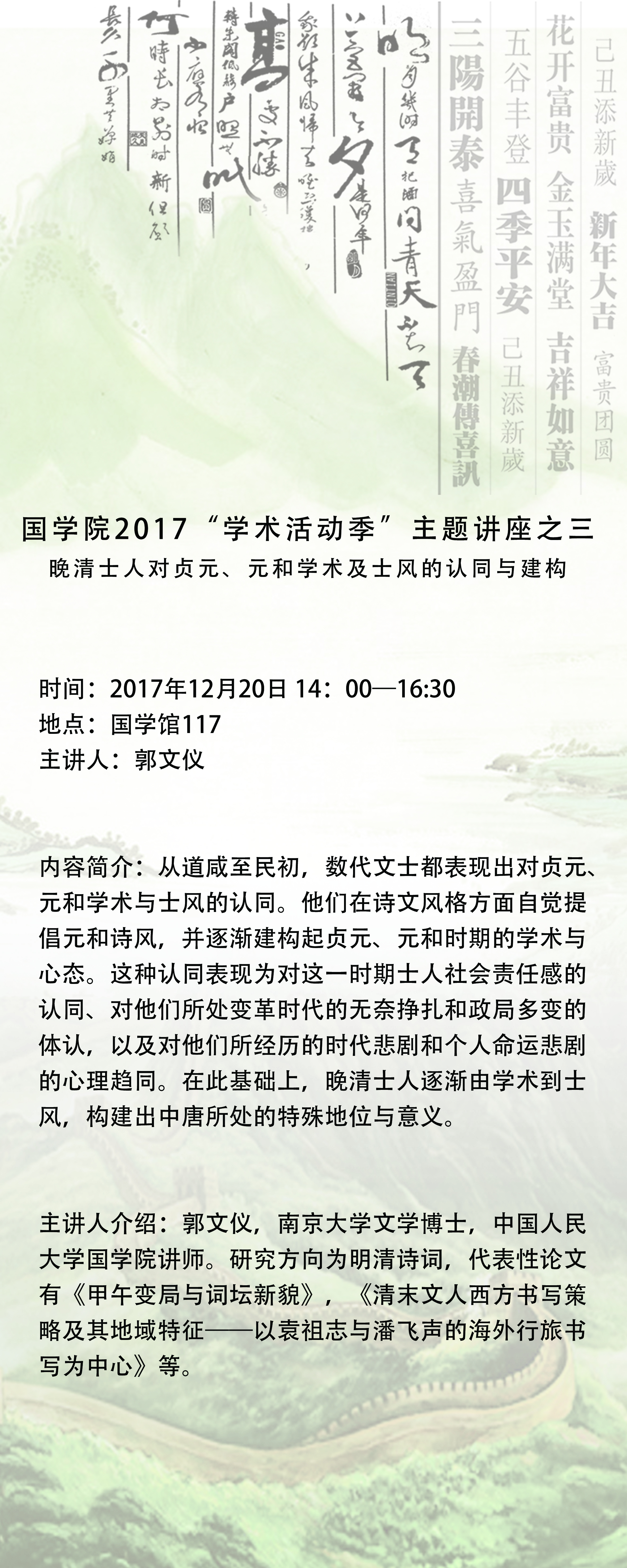 主讲人介绍:郭文仪,南京大学文学博士,琉璃神社 讲师。研究方向为明清诗词,代表性论文有《甲午变局与词坛新貌》,《清末文人西方书写策略及其地域特征——以袁祖志与潘飞声的海外行旅书写为中心》等。