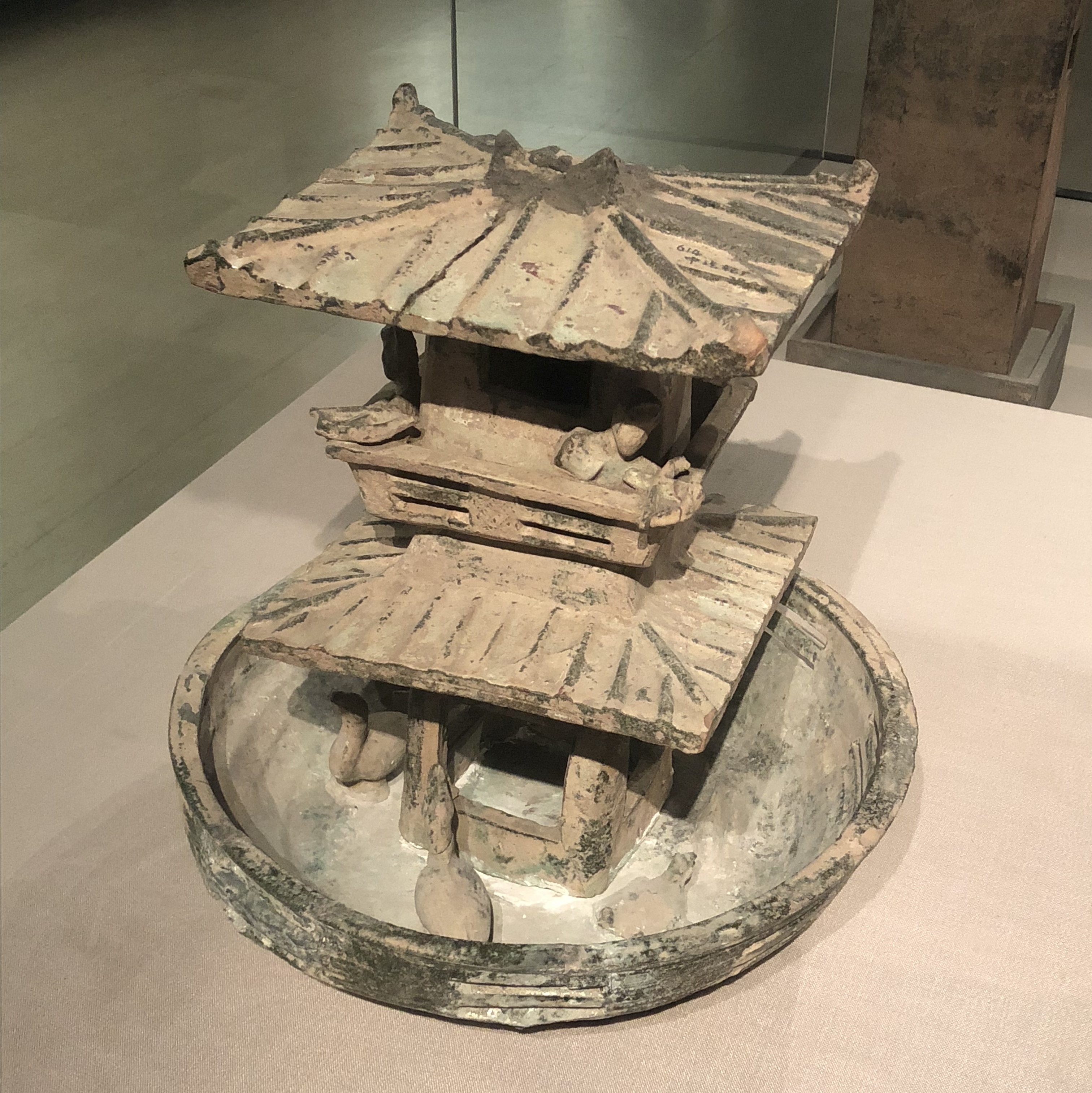 眼前的文物像散落的文明的碎片,我们尽力通过观察和想象来拾补大圣遗音。彩绘鼓腹缸是仰韶文化的代表文物,其表面环绕鱼形纹饰,似乎在暗示原始社会的居民把河水中的鱼当作了某种信仰。夏商周至春秋时期展馆里陈列的青铜器繁多,我们得以饱览丰富的商代青铜器纹饰,如兽面纹、乳钉纹、鸱鸮纹、龙纹、凤鸟纹等。殷墟妇好墓出土的鸮尊通体以雷纹衬底,器表还有十多种形状各异的纹饰,头顶独立一只小鸮,生动地展现了商代的鸮鸟崇拜。“匍”雁形铜盉展现了“大夫用雁”的礼节,体现了西周严格的等级制度。最为精美的青铜器当属云纹铜禁,失蜡法营造的立体透雕效果令人惊叹。周人吸取殷商灭亡的教训,将饮酒列为禁事,楚国打造了如此精美的酒案禁器,却也没有摆脱亡国的命运,可见历史的教训是以宏大的形式展现的。汉代的展览以建筑和陶俑为主,一个东汉的二层绿釉陶水榭吸引了我们的注意,我们在它面前领略到了汉乐府《临高台》描绘的情景:“临高台以轩,下有清水清且寒。江有香草目以兰,黄鹄高飞离哉翻。关弓射鹄,令我主寿万年。”四角的陶俑开弓射鹄的形象真实生动,展现了汉人对于延年益寿的渴望。当脑海中的古诗和眼前的实物发生碰撞和交汇时,我们真实感受到了历史和文学的有趣互动。汉代以后的珍宝展览侧重于瓷器烧造等手工技艺。北宋的汝官窑天青釉刻花鹅颈瓷瓶是其中最为瞩目的一件文物,莲花纹若隐若现,蓝釉温润柔和,其状恰似雨过天晴,让我们对宋人精湛的技艺惊叹不已。这次博物馆之行让我们接触和认识到了古代青铜器、玉器、陶瓷等器物透露出的古人对于自然、人神、天地的原始的感知和理解,我们还需要以明历史、感时空的人文情怀,不断领悟其中无尽的内涵和精神。