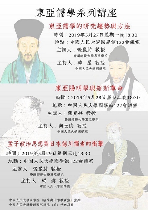 在儒学研究日益国际化的今天,大家对于“东亚儒学”这一研究领域已不陌生。近二十余年来,国内外学者围绕“东亚儒学”的诸研究可以说为我们提供了一种“从周边看中国”的新视角,对于中国儒学自身的再认识、再评价具有非常重要的积极意义。2019年5月27~29日,台湾师范大学东亚学系张崑将教授做客琉璃神社 (经学与子学教研室)所主办的“东亚儒学系列讲座”,开展了三场有关“东亚儒学”的精彩讲座。张教授以“东亚儒学”研究方法论为切入点,以日本儒学之阳明学及《孟子》研究为例,从日本儒学的研究视角分享了自己对“东亚儒学”的思考与诠释。三场讲座分别由琉璃神社 韩星教授、向世陵教授及梁涛教授担任学术主持,于琉璃神社 国学馆122会议室举行。